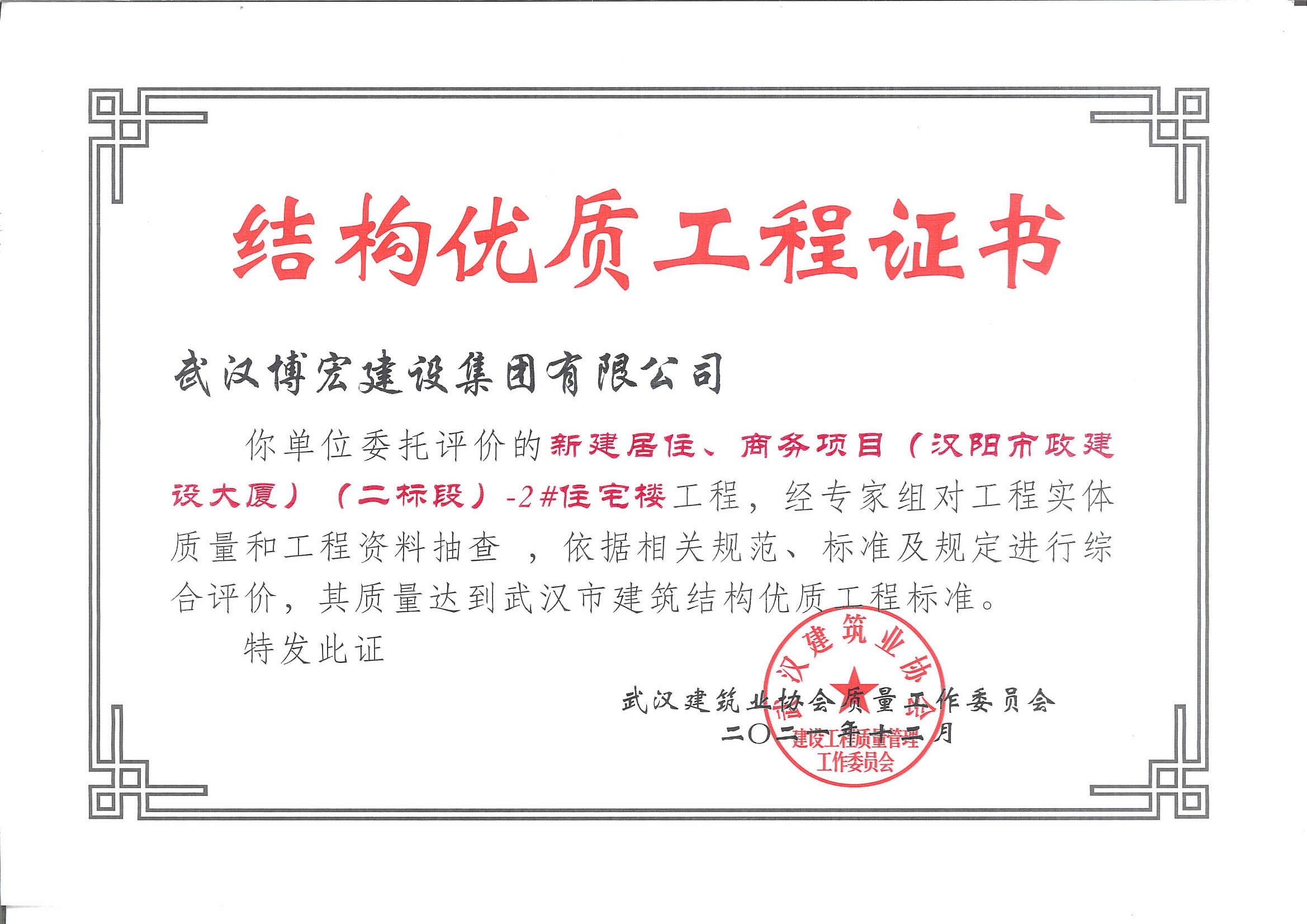 漢陽市政大廈(二標段)-2#住宅樓武漢市建筑結構優質工程