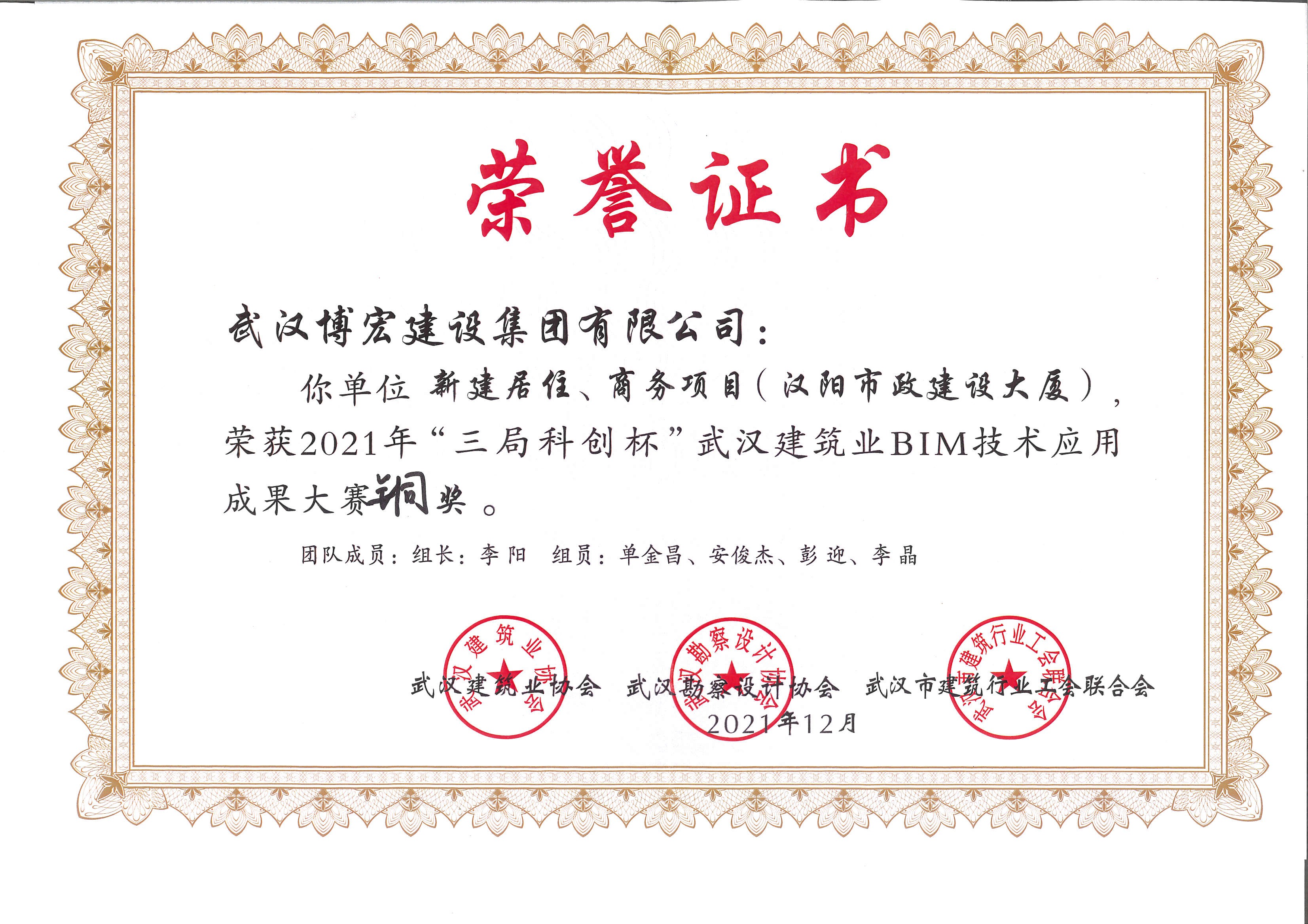 漢陽市政大廈2021年“三局科創杯”武漢建筑業BIM技術應用成果大賽銅獎