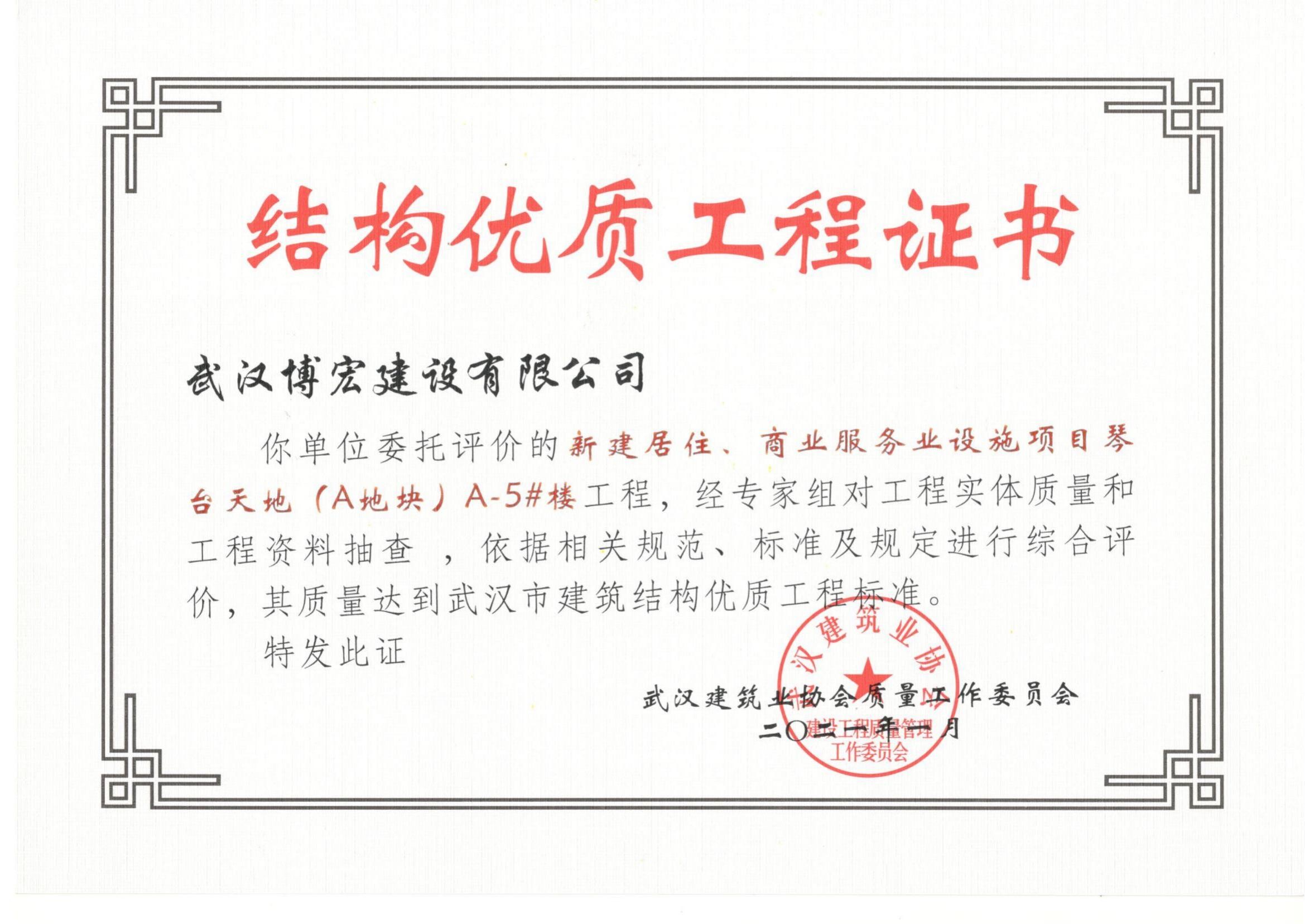 2021年武漢市結構優質工程(琴臺天地(A地塊)5棟