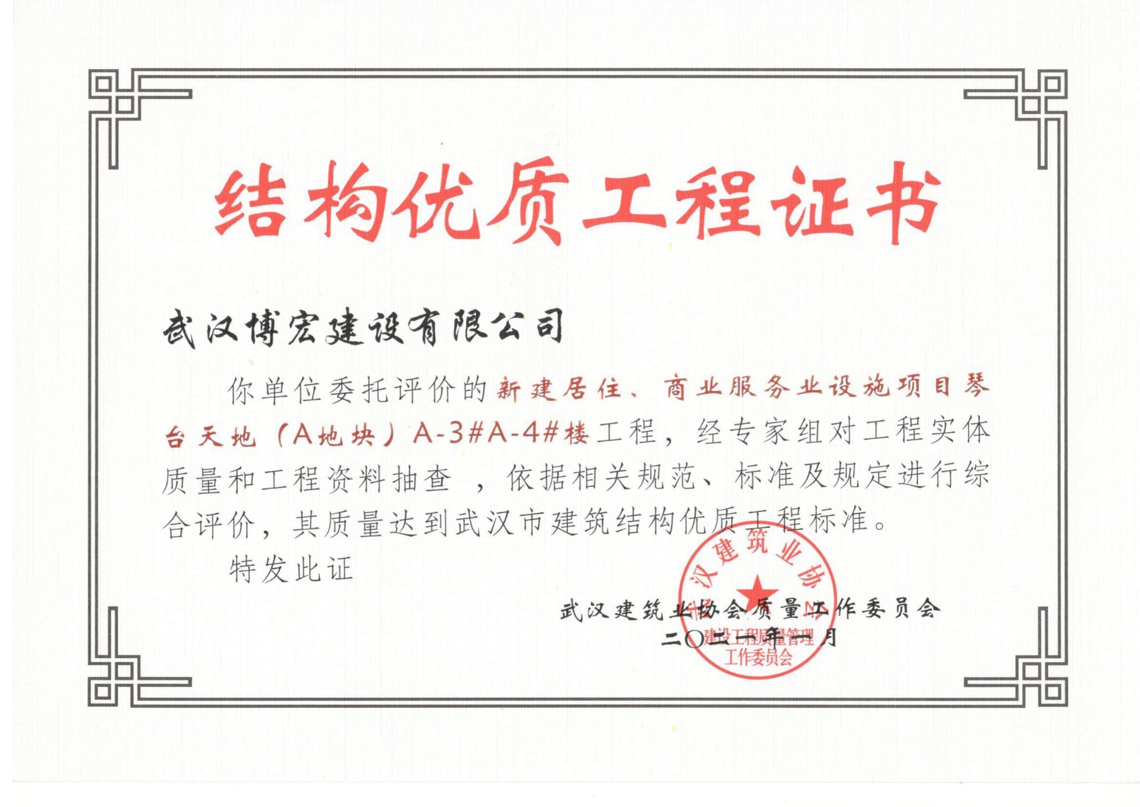 2021年武漢市結構優質工程(琴臺天地(A地塊)3、4棟