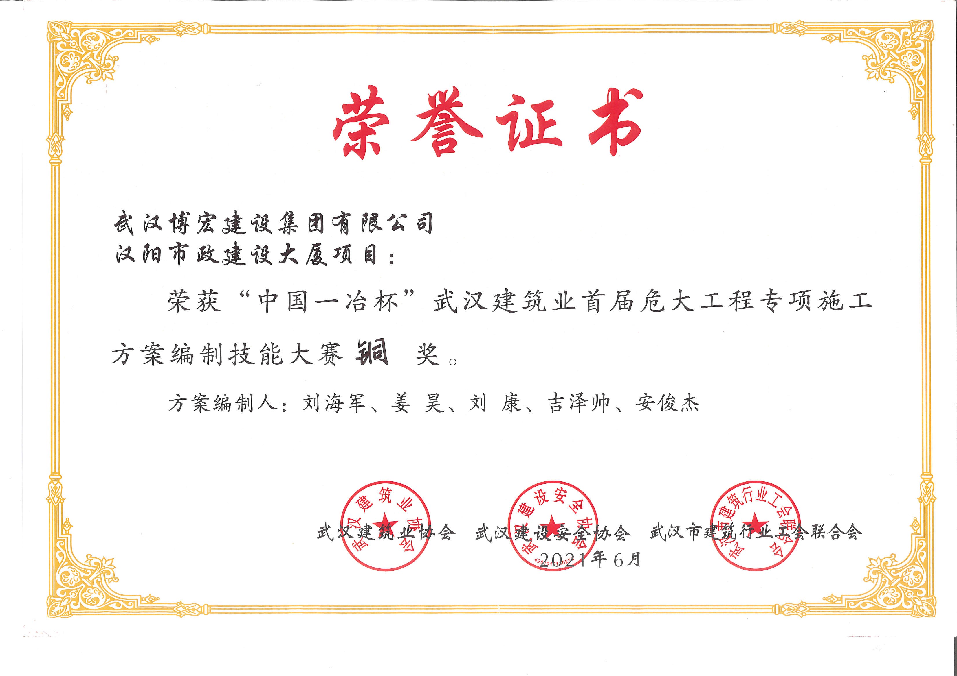 中國一冶杯武漢建筑業首屆危大工程專項施工方案編制技能大賽銅獎