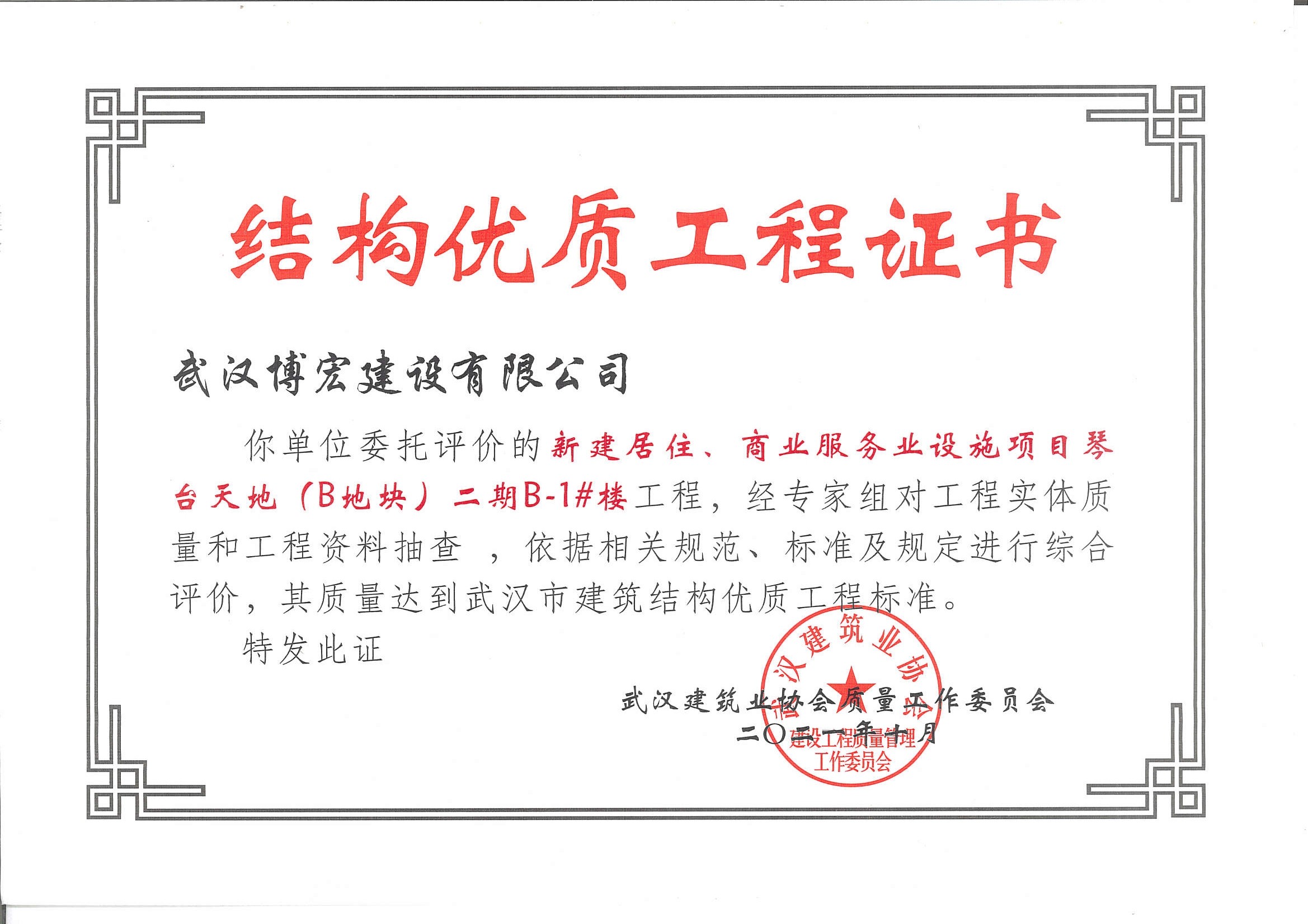 琴臺天地(B地塊)二期B-1#樓武漢市建筑結構優質工程
